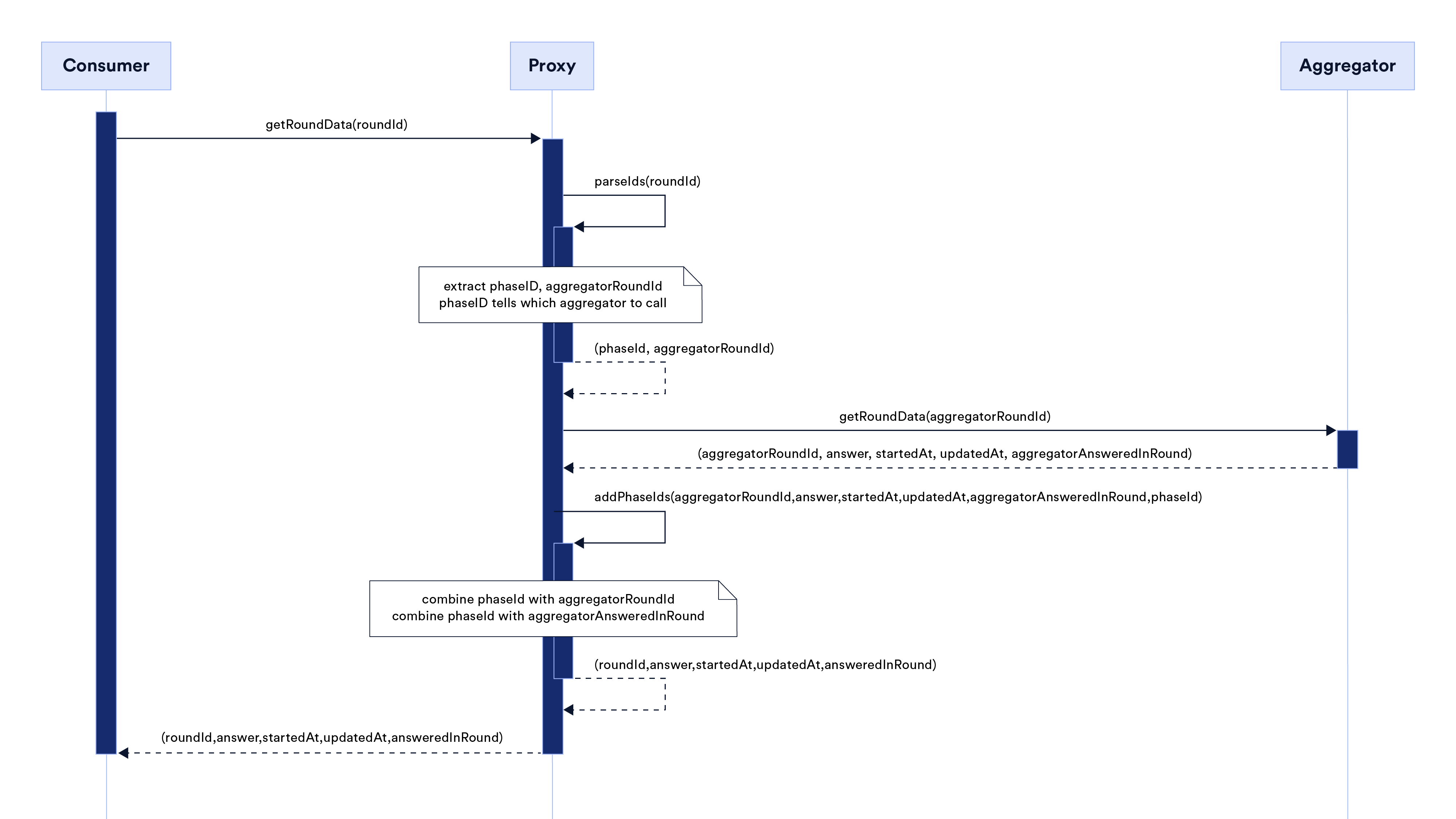 Because a proxy has references to current and all previous underlying aggregators, it needs a way to fetch data from the correct aggregator. The roundId is computed in the proxy contract as shown in the following example: